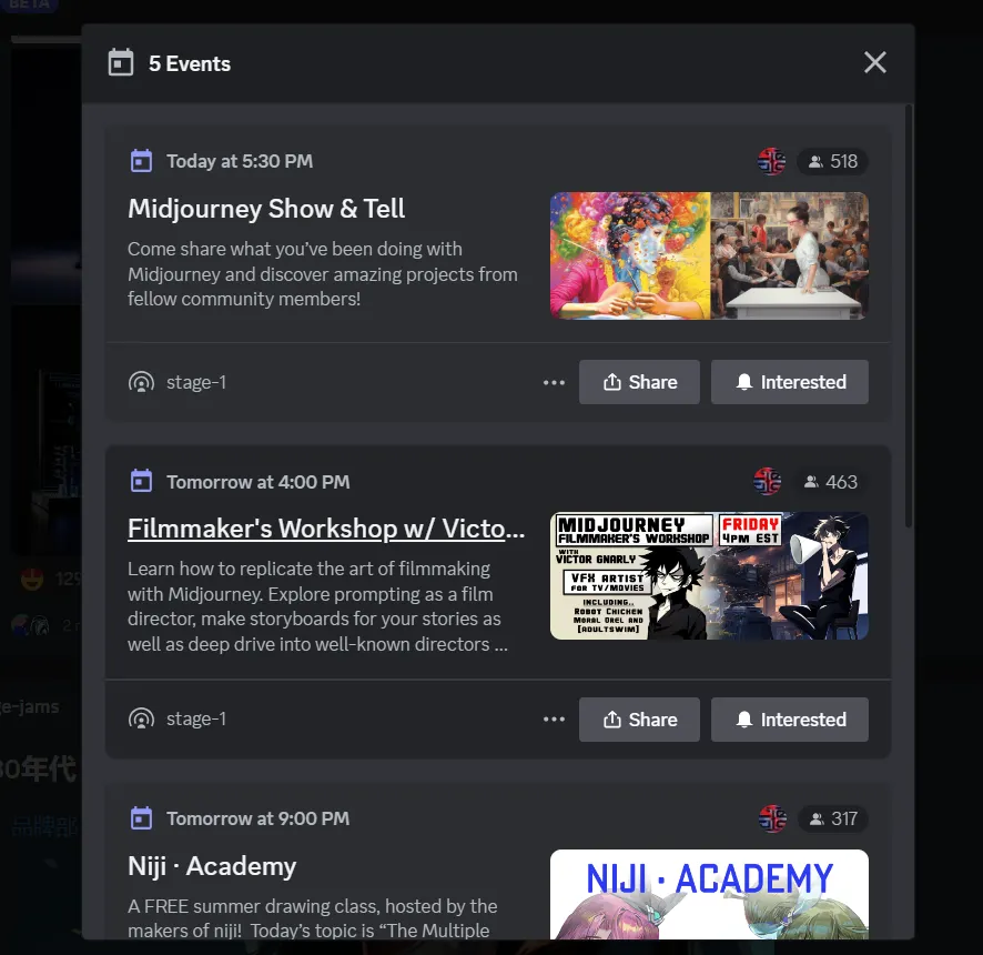 - Midjourney also uses Discord as a medium to create image suggestions, generate them, or alter them.