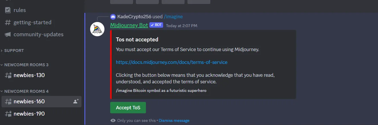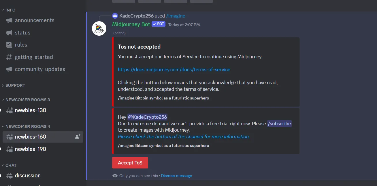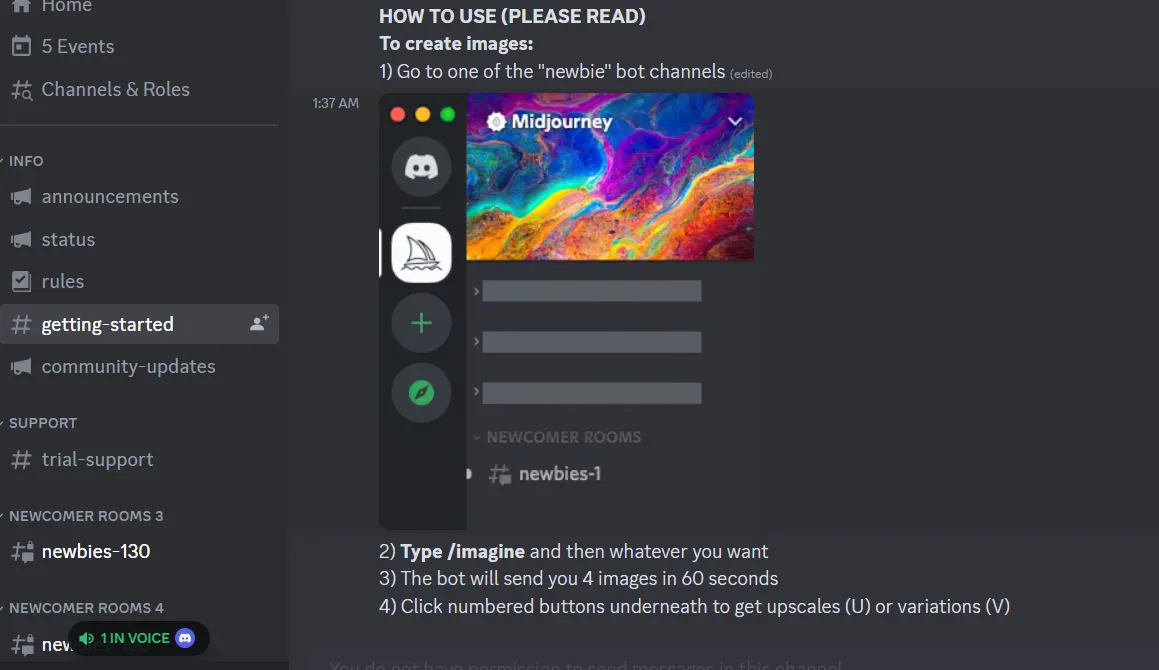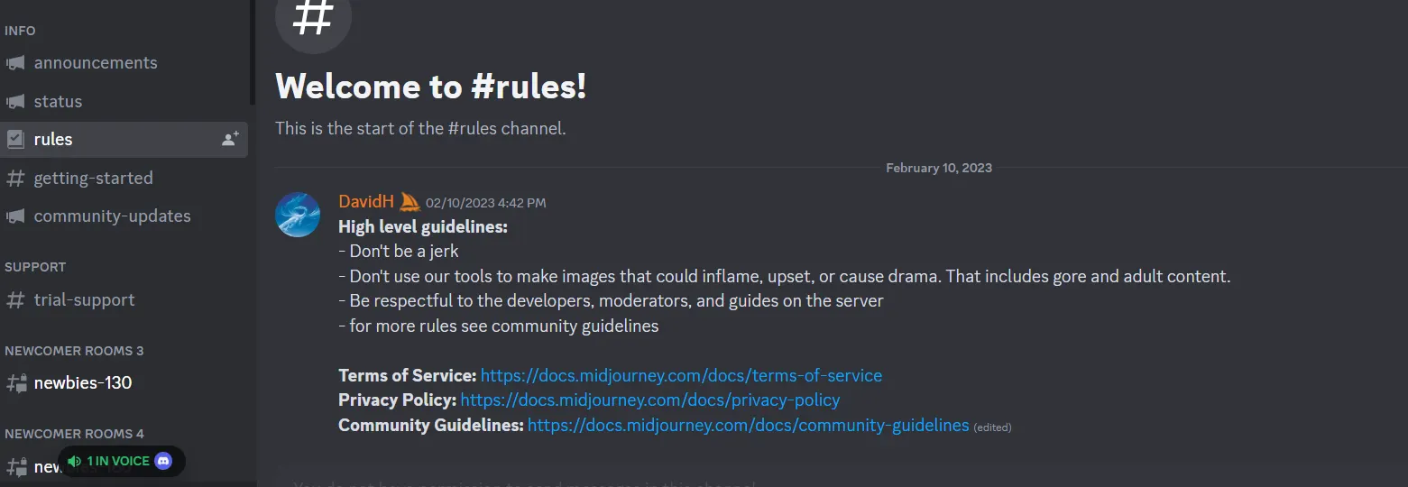 5.Before going further, it’s recommended you read the rules found under Info (#rules). It covers their various policies and guidelines. In brief, Midjourney doesn’t allow sexually explicit or particularly gory/violent images to be created.