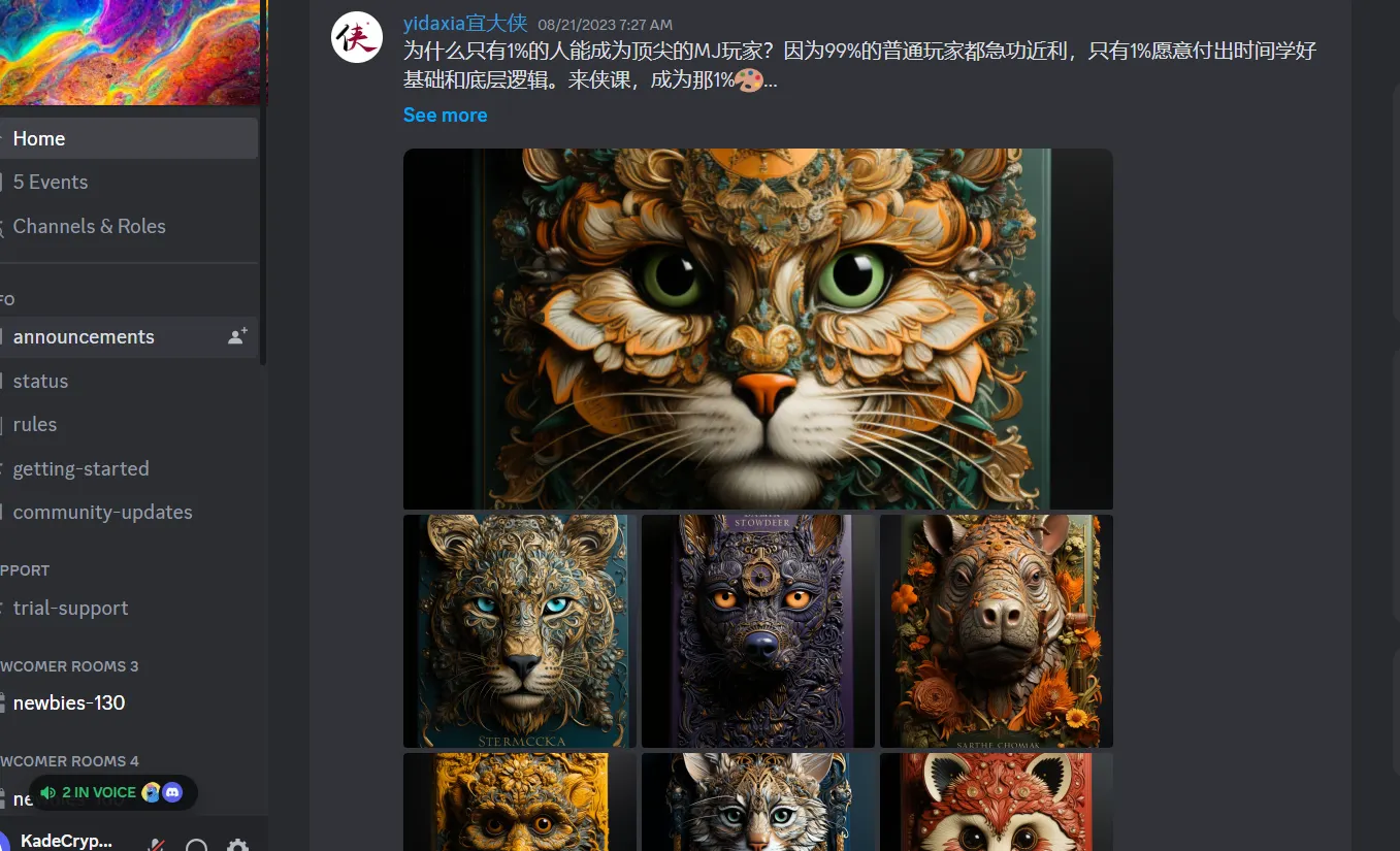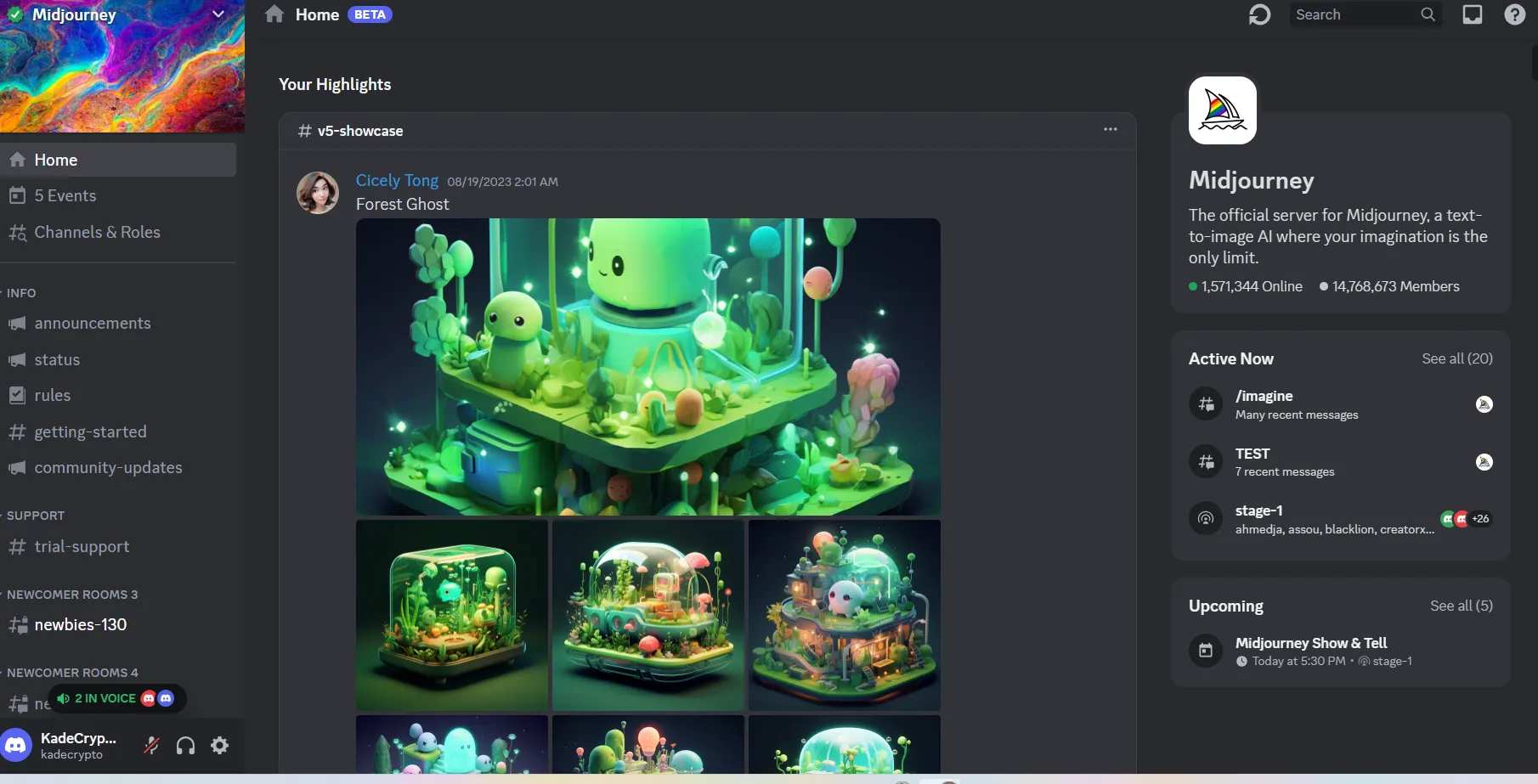 4. That should bring you to the Midjourney server. From here, you can look at the various channels that show Midjourney announcements, image highlights, events, and other useful information. If you’re new to Discord, these channels are found on the left side of your screen.