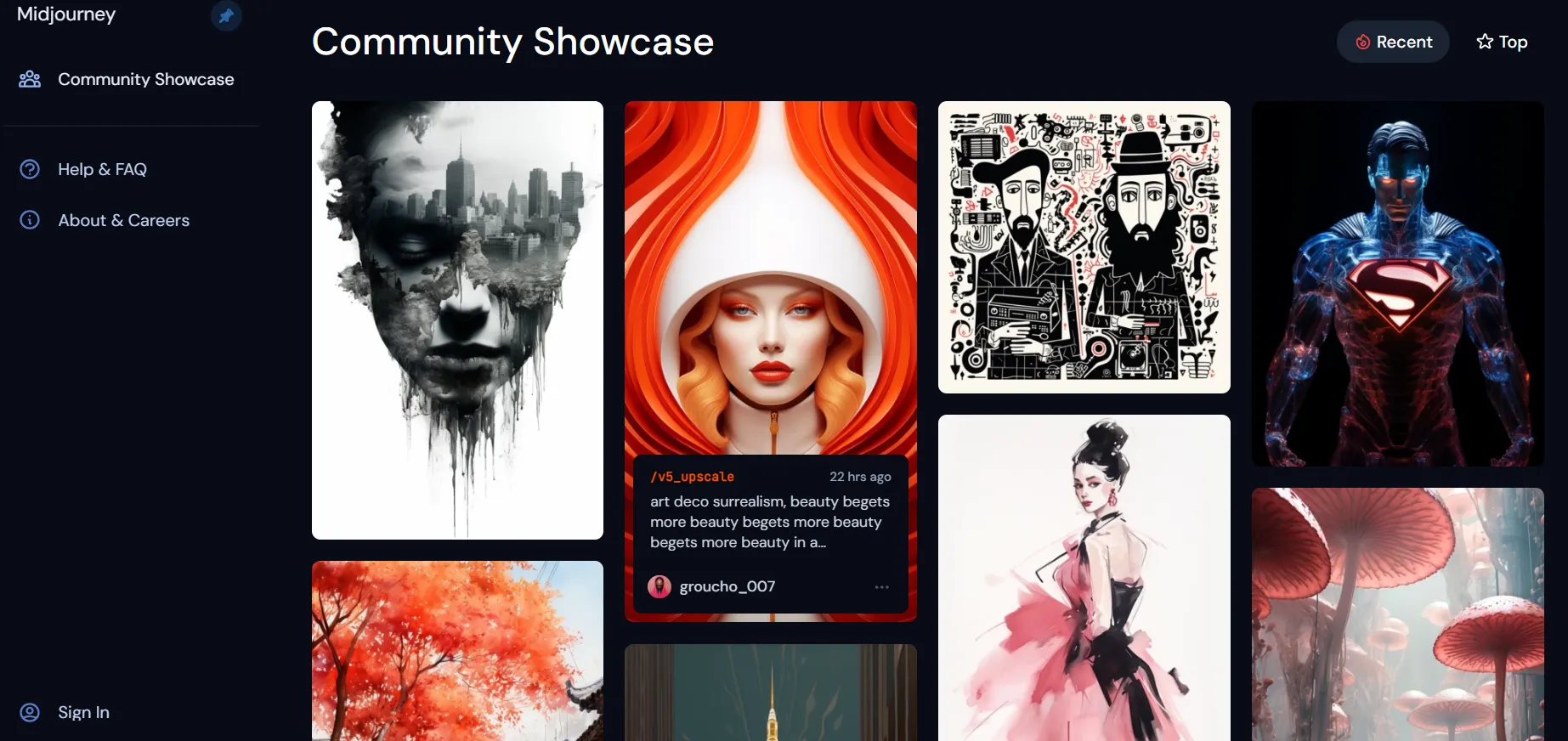 3. From here, you can peruse the Midjourney website to look at images created by the Midjourney community, read the FAQs, and get some other general information. When you’re ready to continue, click “Sign In” again in the bottom left corner of the page.